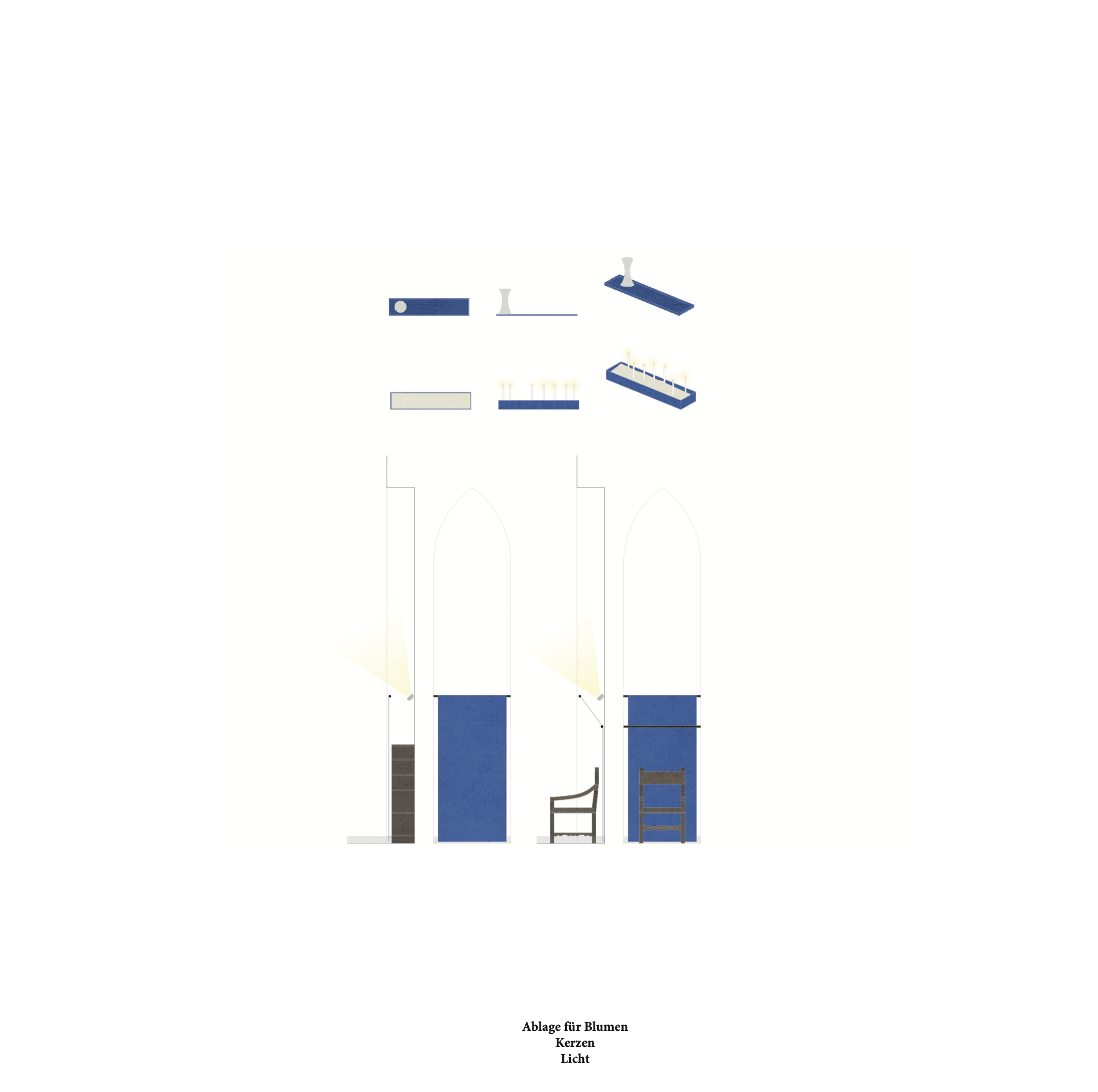 The blue accents that recur in the room’s handcrafted details could symbolize the sky in the niches, lending the mausoleum an air of lightness and a sense of infinity. Complemented by a timeless urn cabinet that harmoniously integrates into the space and engages in dialogue with the bench opposite, the room would be newly balanced in both function and design.
